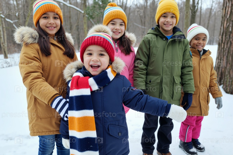 Многонациональные дети улыбаются и позируют вместе на улице зимой