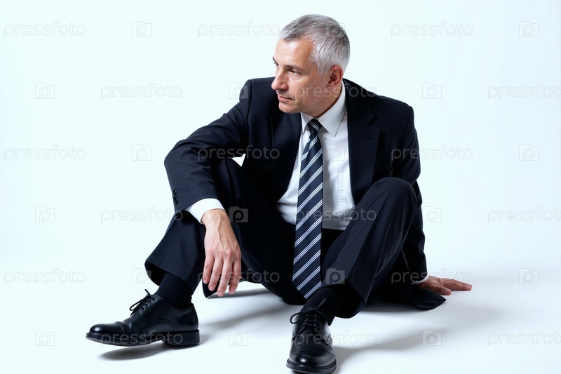 Мужчина среднего возраста сидит на полу, одетый в деловое обмундирование и смотрит в сторону