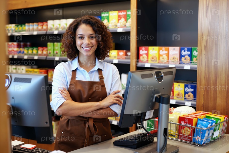 Портрет молодой взрослой женщины, улыбающейся за кассой