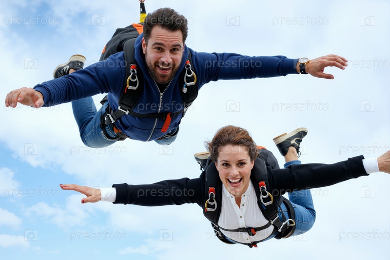 Молодой мужчина и женщина скачут на парашюте вместе против голубого неба