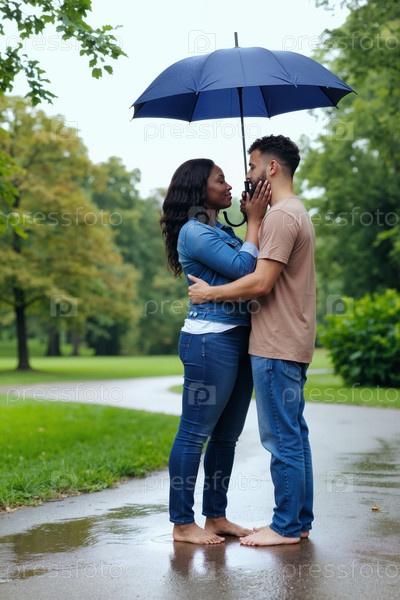Молодая взрослая черная женщина и мужчина обнимаются под зонтиком на открытом воздухе