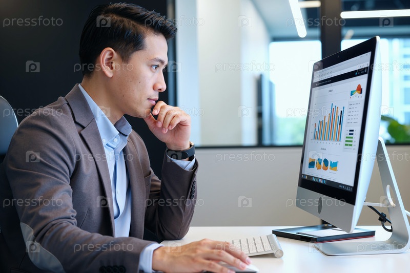 Молодой взрослый азиатский мужчина анализирует финансовые данные на экране настольного компьютера