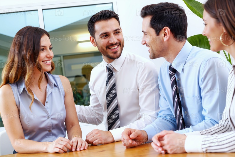 Группа молодых коллег-взрослых, улыбающихся и разговаривающих в помещении