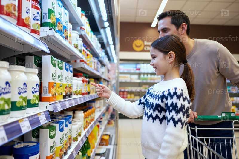 Отец помогает маленькой дочери выбирать продукт в супермаркете