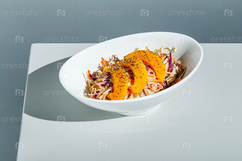Салат Slow Cole с манго и маком на светлом фоне