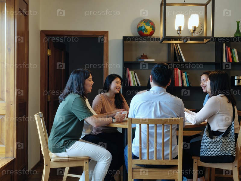 Группа молодых взрослых азиатских женщин и мужчин, ведущих разговор за круглым столом