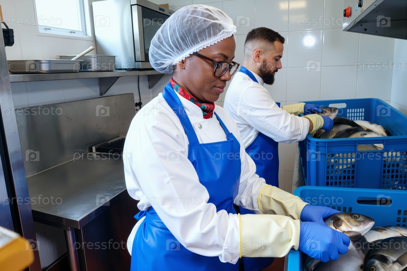 Чернокожая женщина среднего возраста и мужчина убирают свежую рыбу на коммерческой кухне