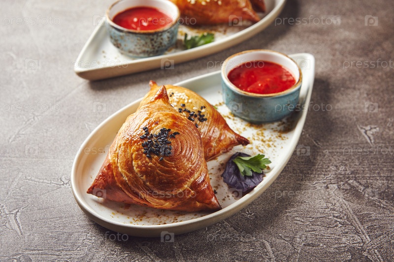 Самса, самсовые торты с мясной начинкой. узбекское национальное блюдо самаса. концепция кухни Центральной Азии, Южной и Восточной Азии