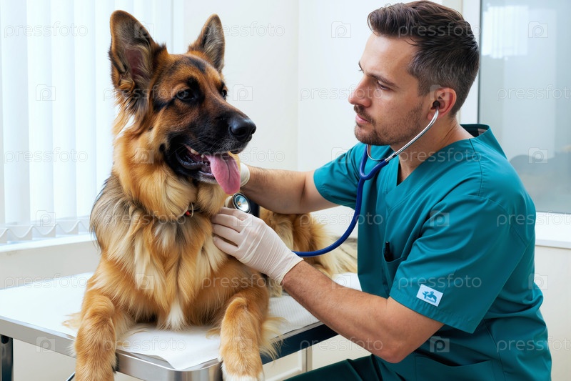 Молодой взрослый мужской ветеринар, осматривающий немецкого овчарка