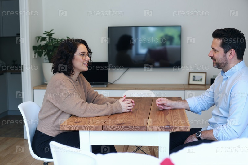 Молодая женщина и молодой мужчина разговаривают в помещении