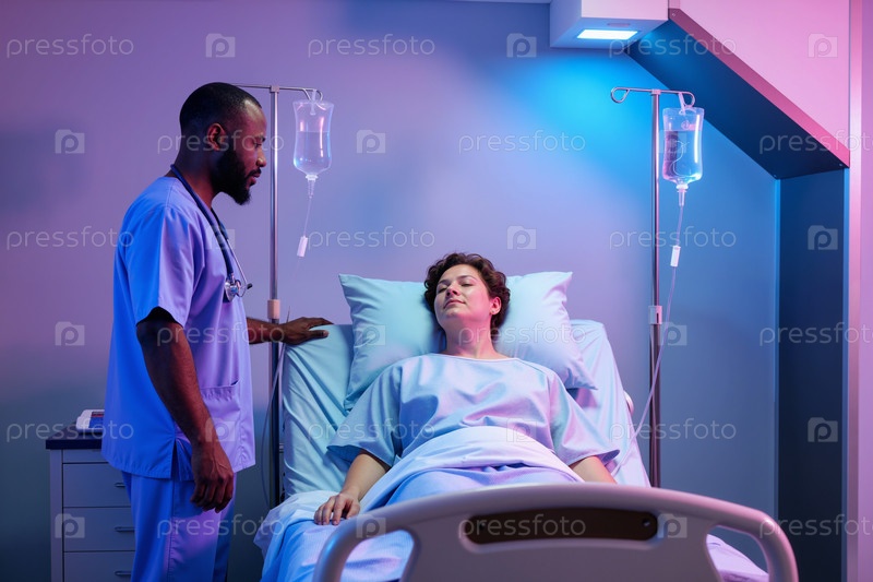 Женщина средних лет, лежащая в больничной постели с черным мужчиной медсестра стоит