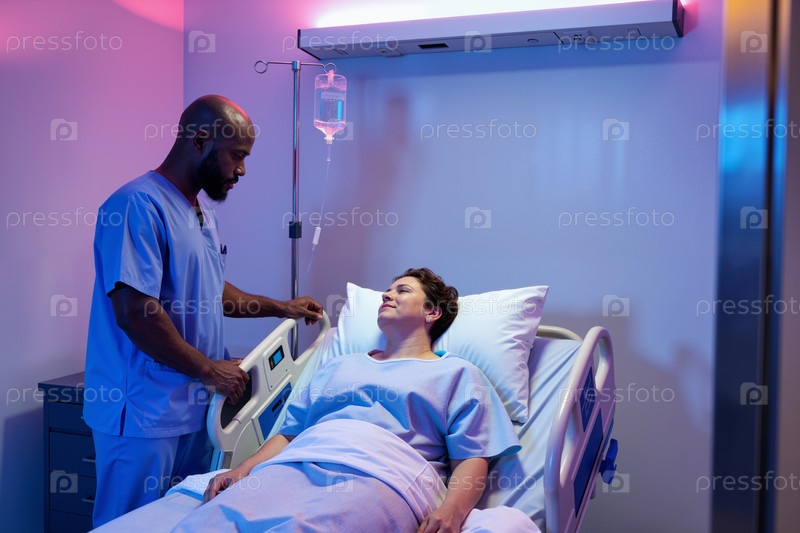Женщина среднего возраста, лежащая в больничной постели с участием чернокожего мужчины