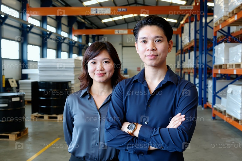 Портрет молодого взрослого азиатского мужчины и женщины, уверенно стоящих на складе