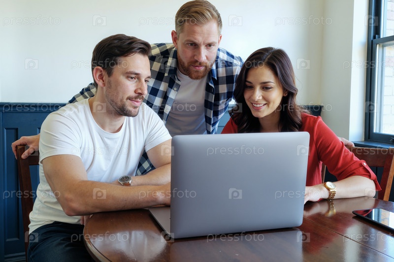 Группа молодых взрослых коллег по работе, сотрудничающих с помощью ноутбука