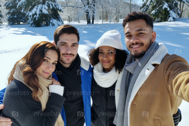 Группа молодых мультиэтнических взрослых, улыбающихся на улице во время зимнего снегопада