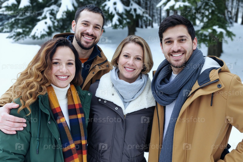 Группа друзей молодых взрослых, улыбающихся на открытом воздухе зимой