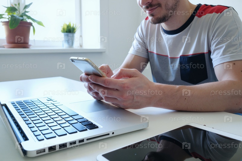 Молодой человек использует смартфон, работая на ноутбуке в современном офисе