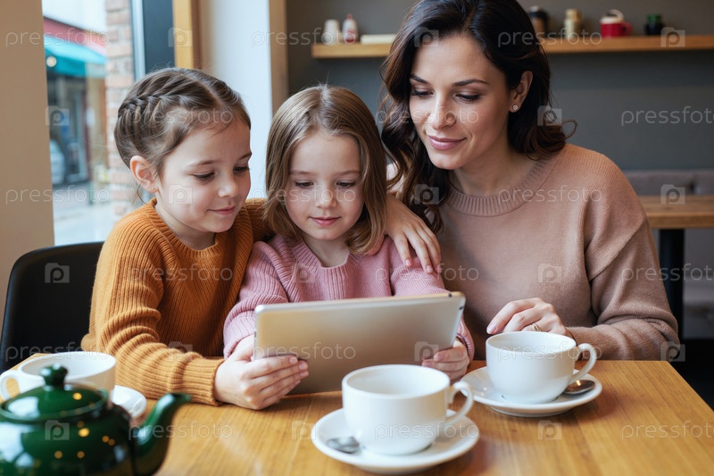 Мать смотрит, как две маленькие дочери используют цифровые планшеты в помещении