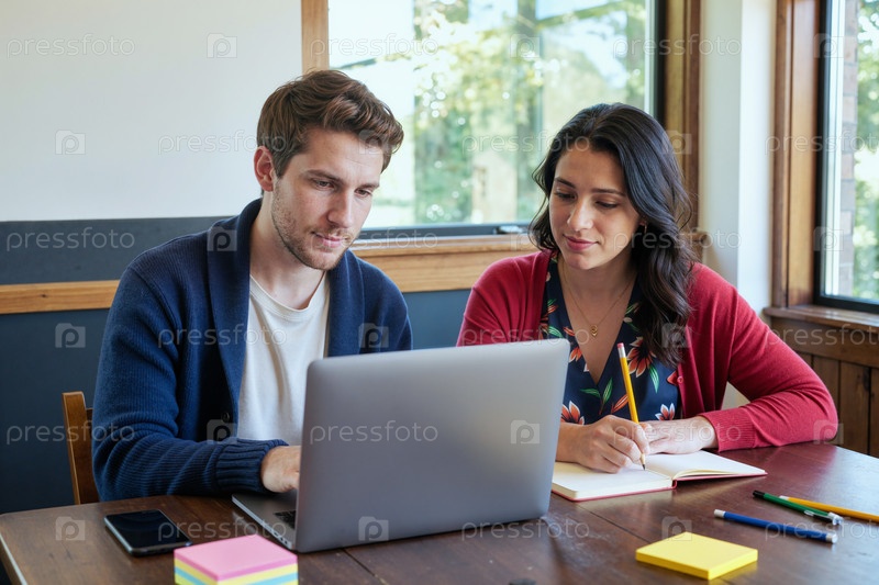 Молодой человек и латиноамериканская молодая женщина сотрудничают с помощью ноутбука в помещении