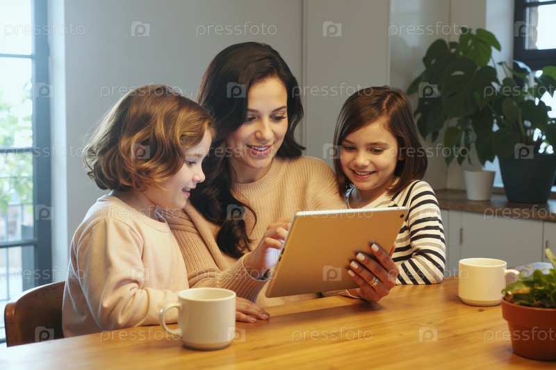 Молодая взрослая женщина обучает двух детей с помощью цифрового планшета