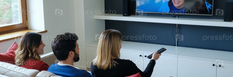 Мультиэтнические молодые взрослые смотрят телевизор вместе в современной гостиной