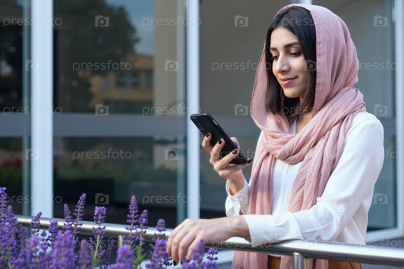 Молодая взрослая женщина с Ближнего Востока, использующая смартфон На улице возле цветов лаванды