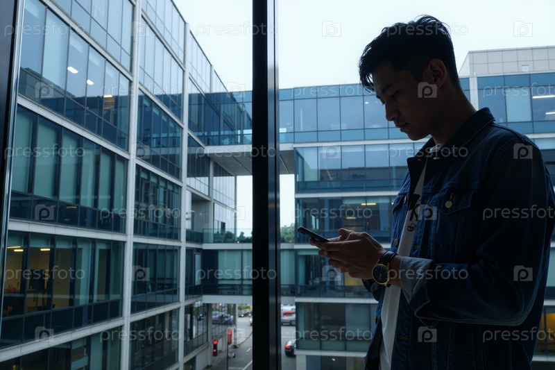 Молодой взрослый азиатский мужчина использует смартфон возле окна офисного здания