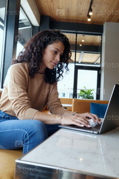Молодая взрослая женщина, работающая удаленно с помощью ноутбука в современном офисе