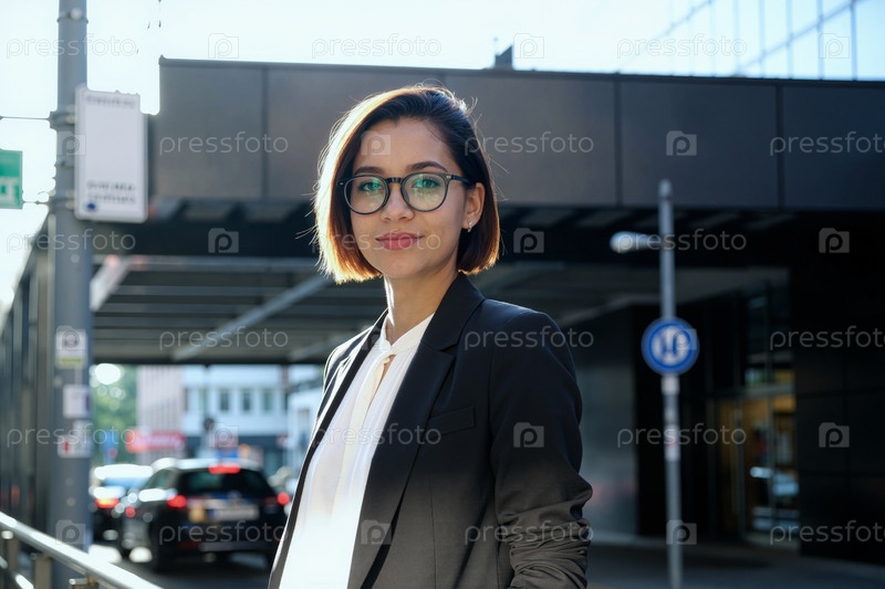 Портрет молодой взрослой женщины в очках, стоящей на улице