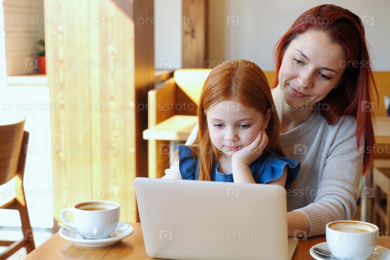 Молодая женщина помогает ребенку-девочке с помощью ноутбука в кафе