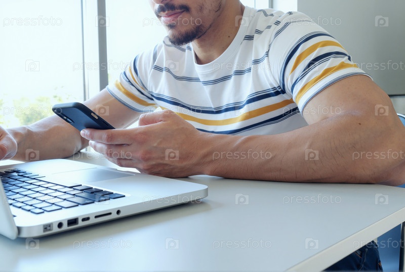 Молодой взрослый мужчина использует смартфон, работая на ноутбуке в помещении
