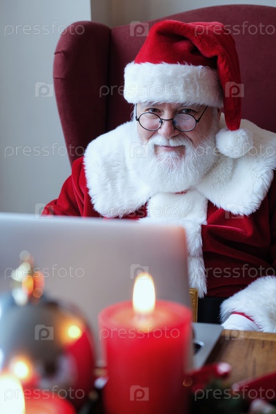 Портрет пожилого человека, одетого в костюм Санты и использующего ноутбук внутри дома