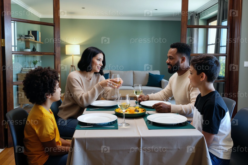 Многонациональная семья наслаждается ужином вместе за домашним обеденным столом