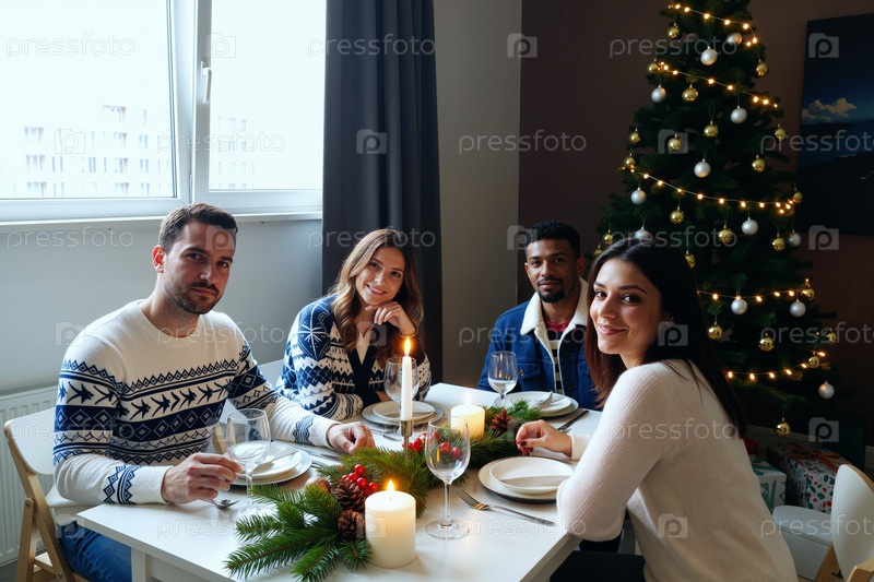 Различные молодые взрослые собираются вокруг стола, чтобы отпраздновать рождественские праздники