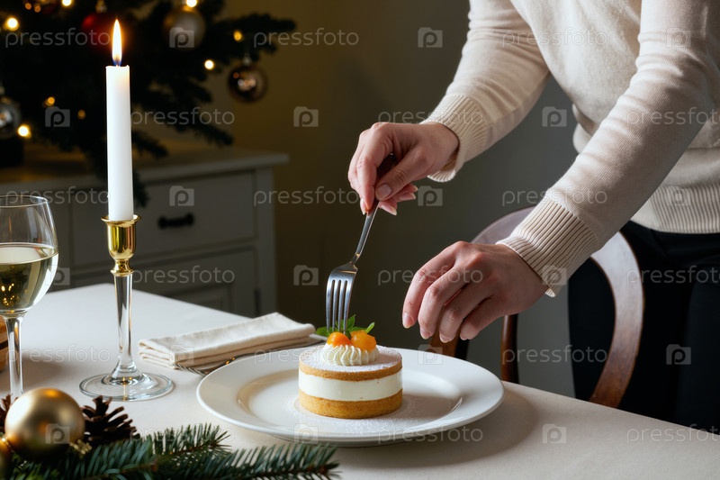 Молодая взрослая женщина режет десертный торт во время праздничного ужина