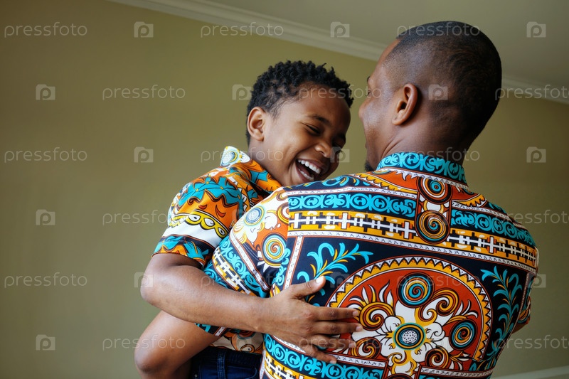 Обнимая смеющегося чернокожего ребенка, улыбаясь внутри