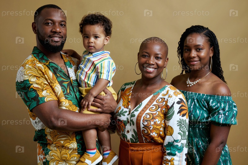 Черная семья улыбается вместе, позируя для студийного портрета на коричневом фоне