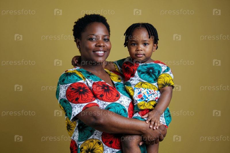 Портрет чернокожей женщины, держащей маленького ребенка и улыбающейся на желтом фоне