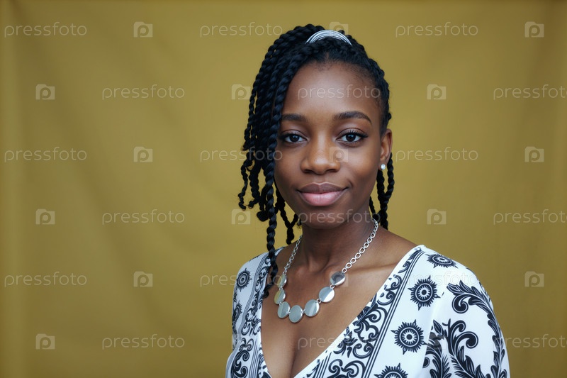 Портрет молодой взрослой чернокожей женщины, улыбающейся на желтом фоне