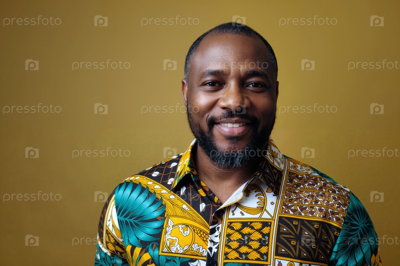 Портрет чернокожего человека среднего возраста, улыбающегося на простом желтом фоне