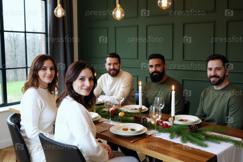 Группа молодых взрослых мужчин и женщин, наслаждающихся праздничным праздничным ужином