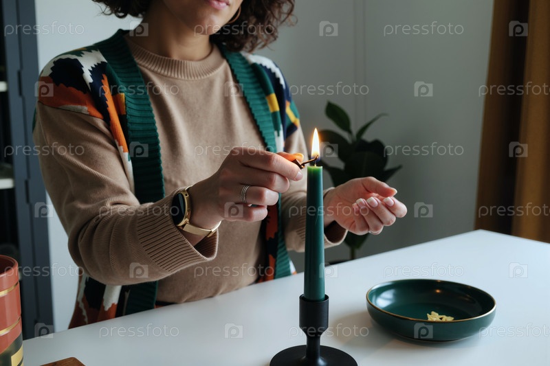 Молодая взрослая женщина зажигает свечу с спичечным палком в помещении