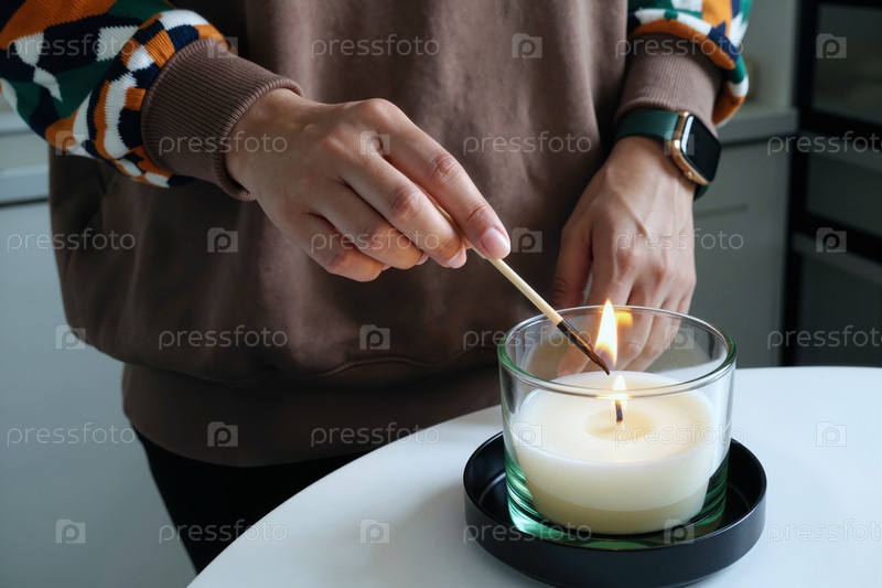 Молодая взрослая женщина освещает ароматную свечу с деревянной спичечной палкой