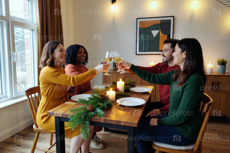 Молодые взрослые мультиэтнические друзья тостируют бокалы с вином празднуют праздник