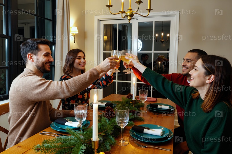 Молодые взрослые мультиэтнические друзья празднуют каникулы, тостируя вместе очками
