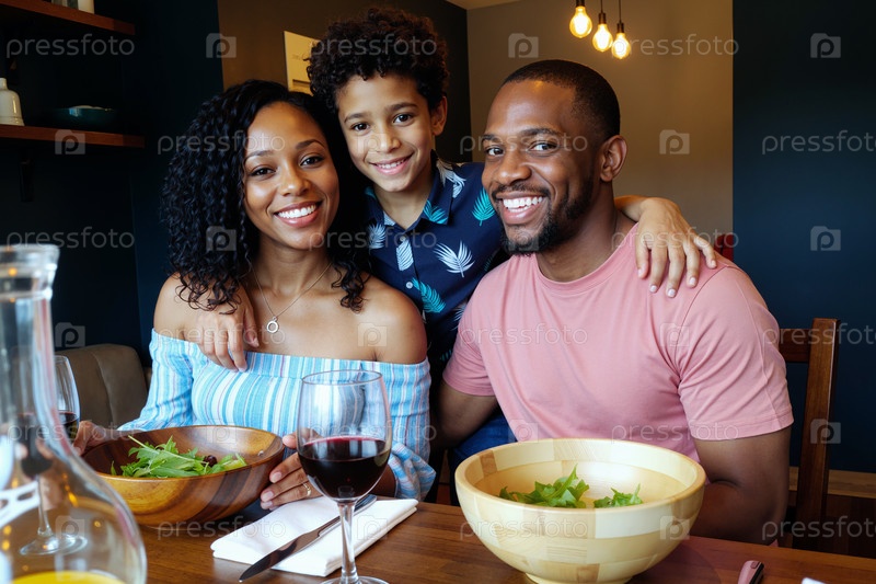 Портрет молодой чернокожей семьи, улыбающейся во время совместной еды салата в помещении