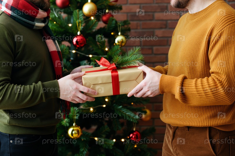 Молодые взрослые мужчины обмениваются коробками для подарков перед рождественской елкой