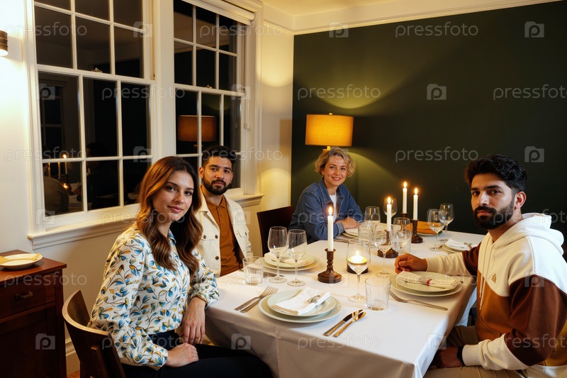 Портрет мультиэтнических молодых взрослых, сидящих вместе за обеденным столом