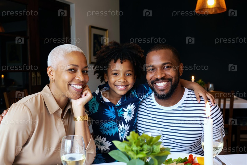 Портрет счастливой чернокожей семьи, улыбающейся вместе во время ужина дома