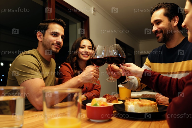 Группа друзей-молодых взрослых, тостирующих винными стаканами во время обеденного собрания